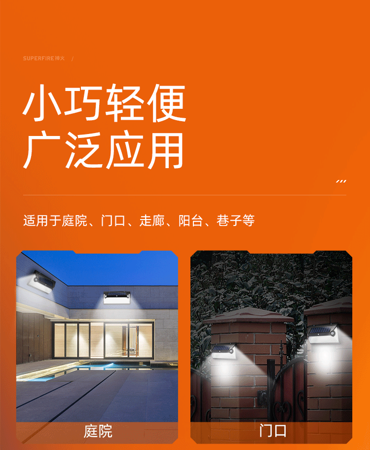 1.雙向人體感應,靈敏度高,感應探頭設計在產(chǎn)品兩側(cè),感應角度180度,感應距離3-5米。夜晚在開燈的模式下人來全亮人走微亮,微光模式更節(jié)能; 2.采用ABS塑料,硬度高耐磨損不易破損,防水效果好; 3.多晶硅太陽能板,堅固耐用,太陽能轉(zhuǎn)化率高