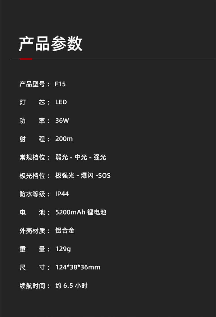 1、精致小巧設計,37G迷你便攜不累贅; 2、鋁合金外殼,防水抗壓; 3、五檔一鍵切換,適用多重場景。