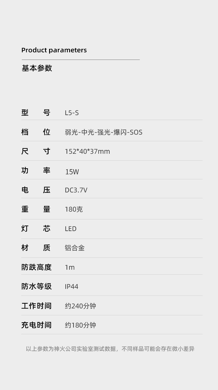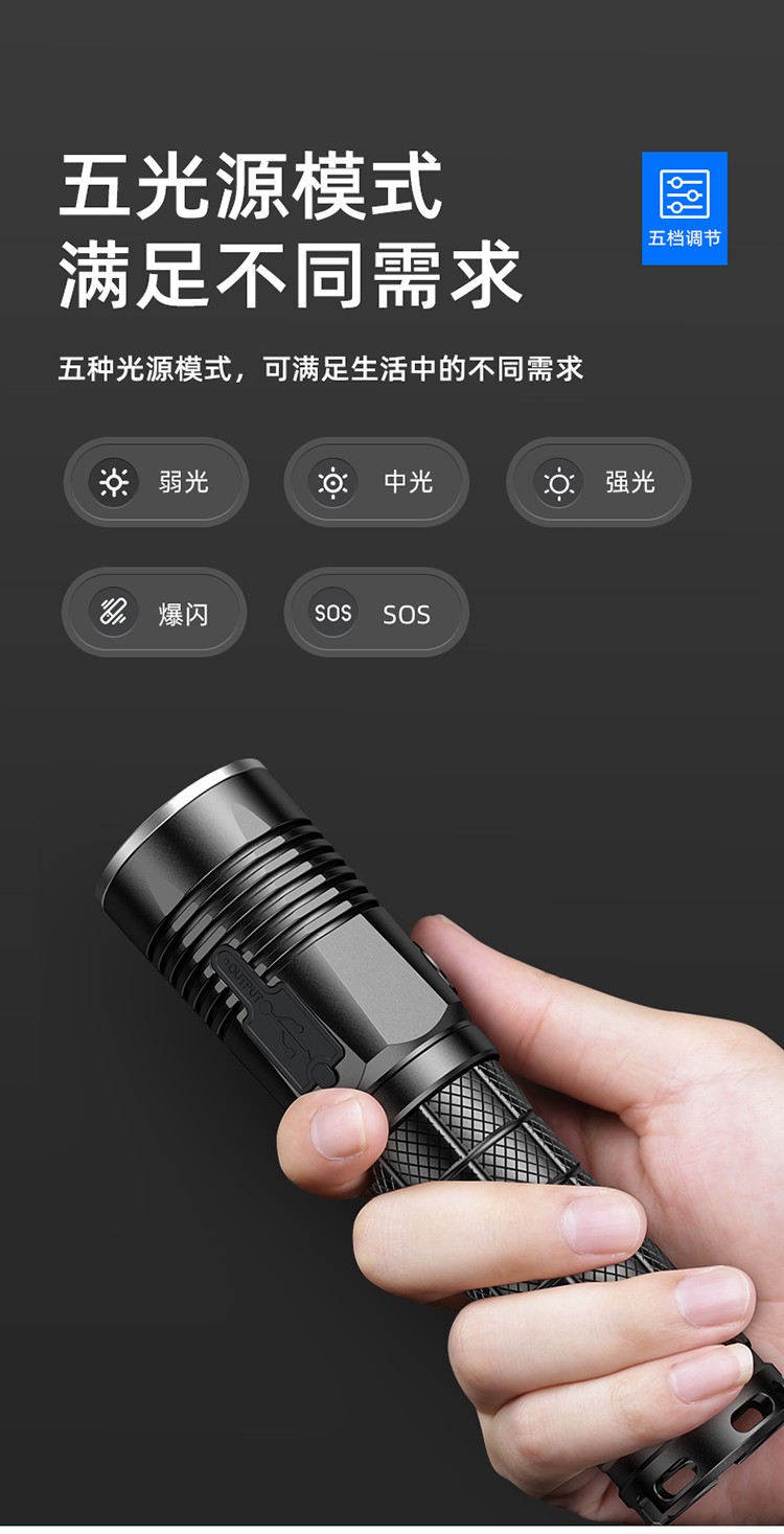 1、精致小巧設(shè)計(jì),37G迷你便攜不累贅; 2、鋁合金外殼,防水抗壓; 3、五檔一鍵切換,適用多重場景。