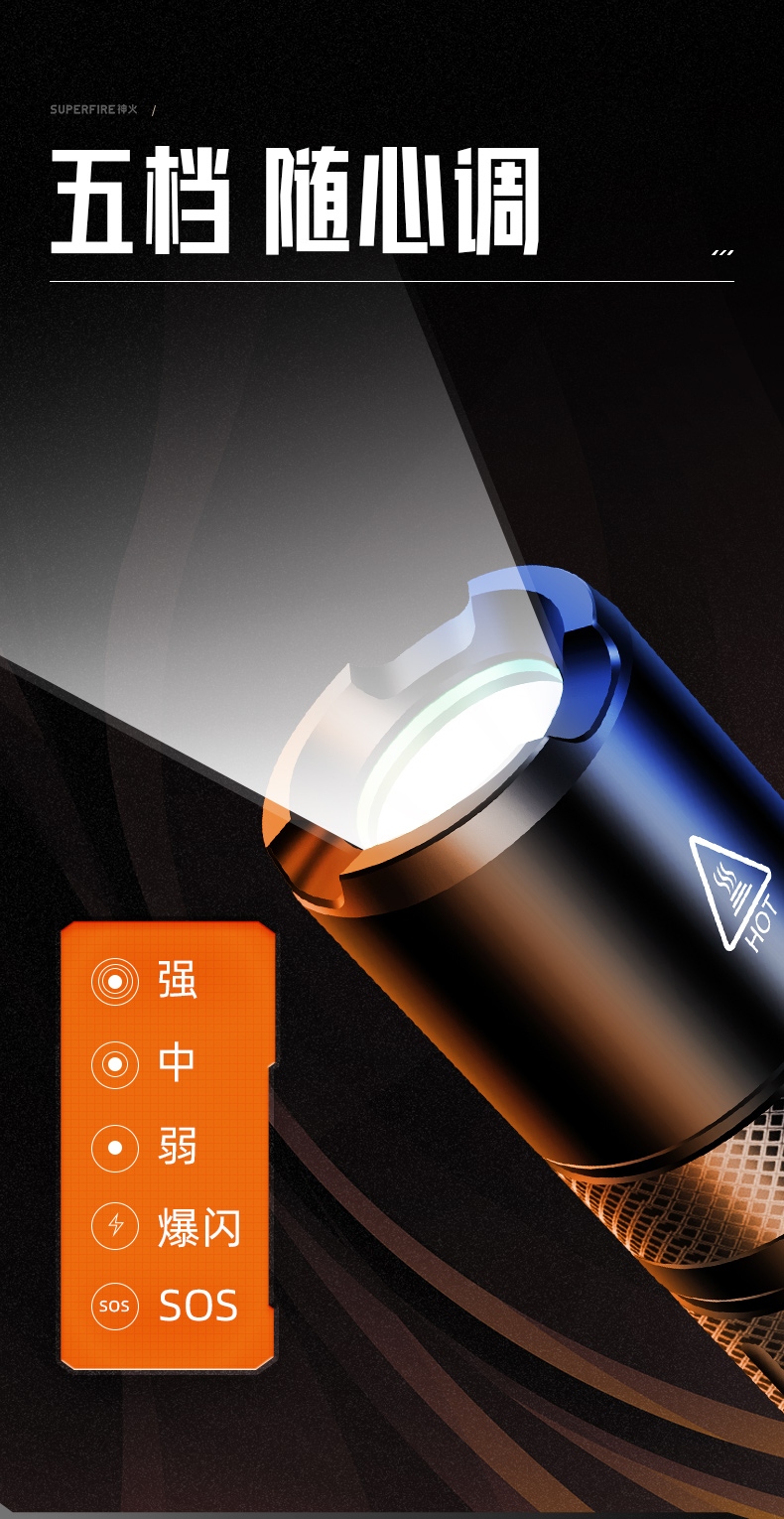 1、精致小巧設(shè)計,37G迷你便攜不累贅; 2、鋁合金外殼,防水抗壓; 3、五檔一鍵切換,適用多重場景。