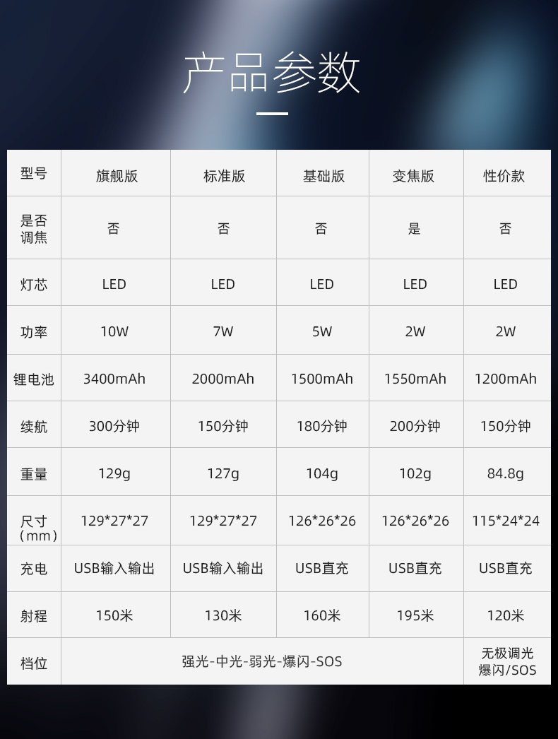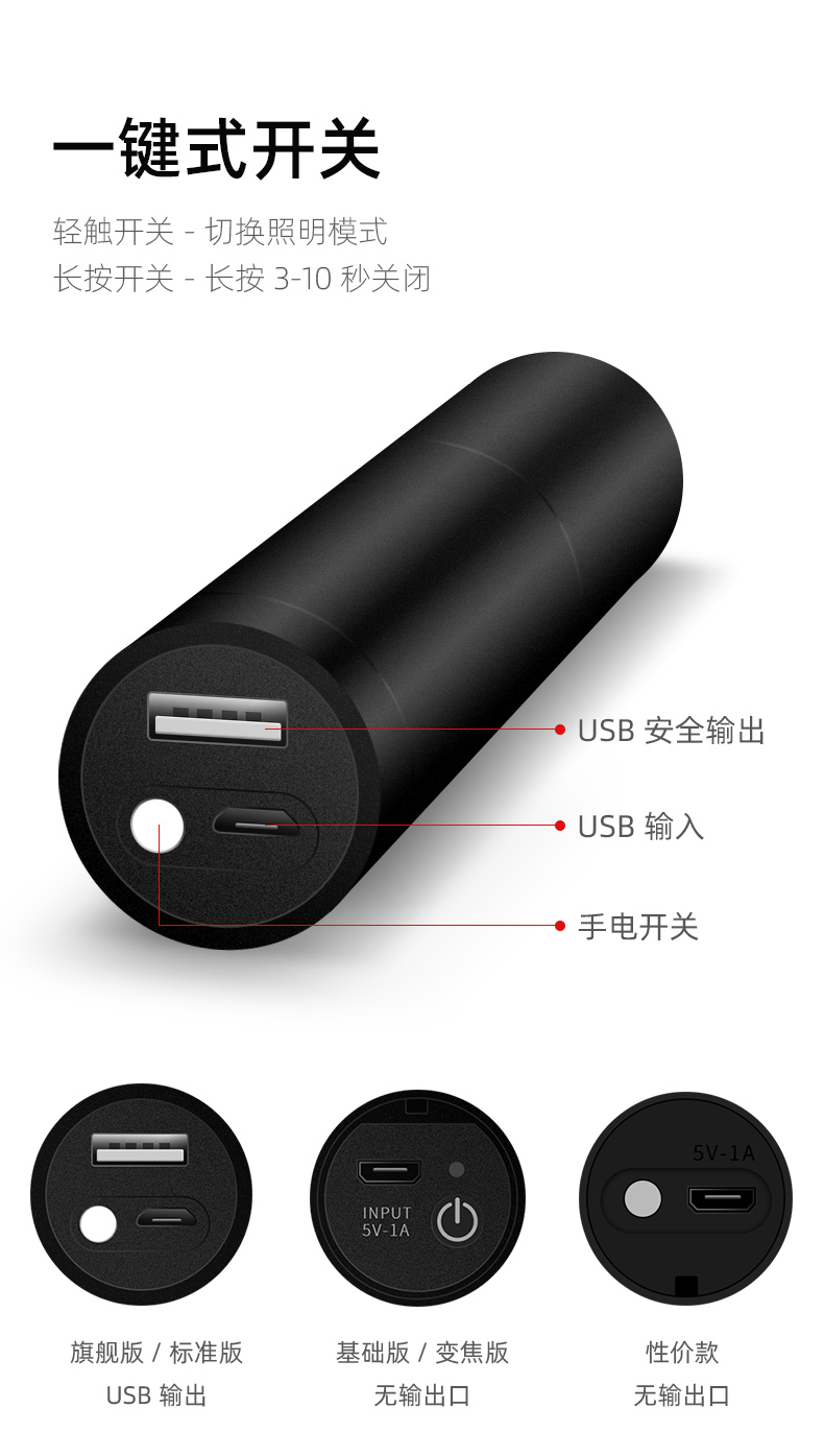 1、精致小巧設(shè)計,37G迷你便攜不累贅; 2、鋁合金外殼,防水抗壓; 3、五檔一鍵切換,適用多重場景。