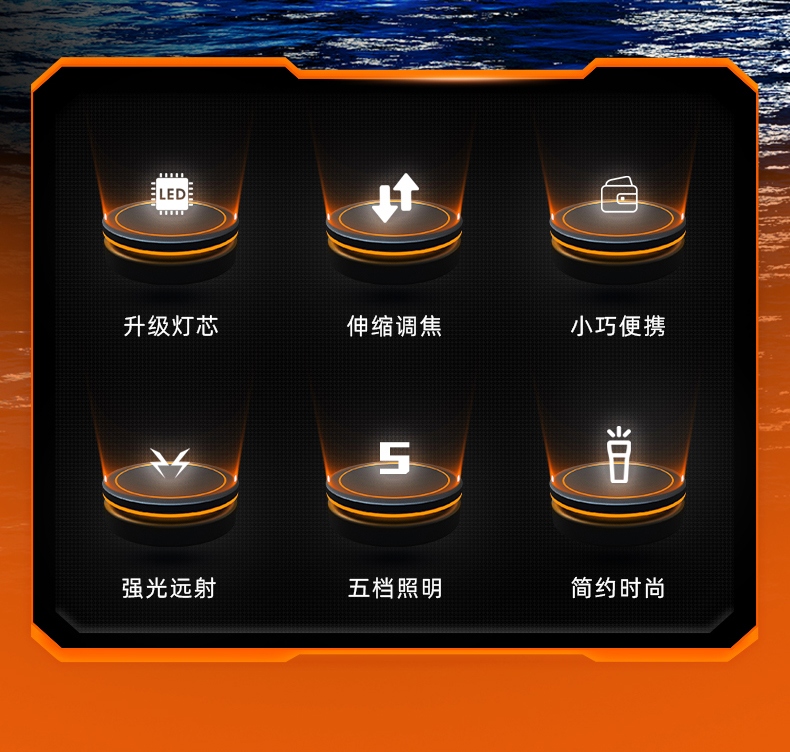 1、五檔調(diào)光,滿足不同環(huán)境下的使用要求 。按壓尾置開關(guān)按鍵開啟即強(qiáng)光檔 ,續(xù)按調(diào)檔(強(qiáng)光-中光-弱光- 爆閃-SOS-關(guān))可循環(huán)換擋。任何擋位長按3秒左右關(guān)閉光源。