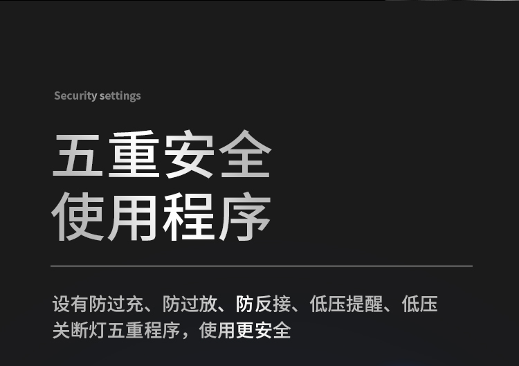 3顆P50燈芯,設(shè)有省電程序,續(xù)航更持久。設(shè)有防過充、防過放、防反接、低壓提醒、低壓關(guān)斷燈五重程序,使用更安全。