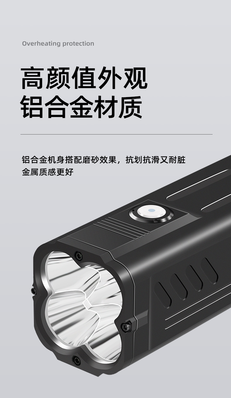 高亮四核大手電,帶過熱保護會隨外界溫度自動調節(jié)亮度,以及過充過放保護,智能快充帶電量指示,金屬腰夾一燈多用,超高容量鋰電池續(xù)航可達13小時,任意檔位長按2S可關閉