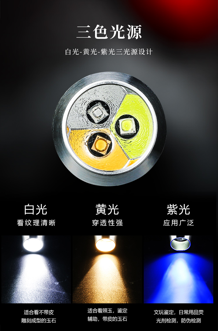 1、三光鑒定,照玉更專業(yè):白光鑒定玉石內(nèi)部結(jié)構(gòu),瑕疵,工藝;黃光用于押玉賭石,看帶皮的石頭;紫光用于鑒定玉石注膠蜜蠟,琥珀真?zhèn)危炚鎮(zhèn)悟炩n,檢測熒光劑。