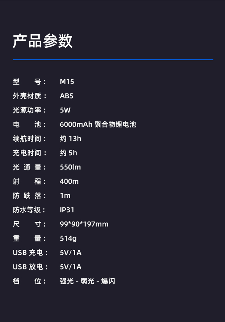 3顆P50燈芯,設(shè)有省電程序,續(xù)航更持久。設(shè)有防過(guò)充、防過(guò)放、防反接、低壓提醒、低壓關(guān)斷燈五重程序,使用更安全。