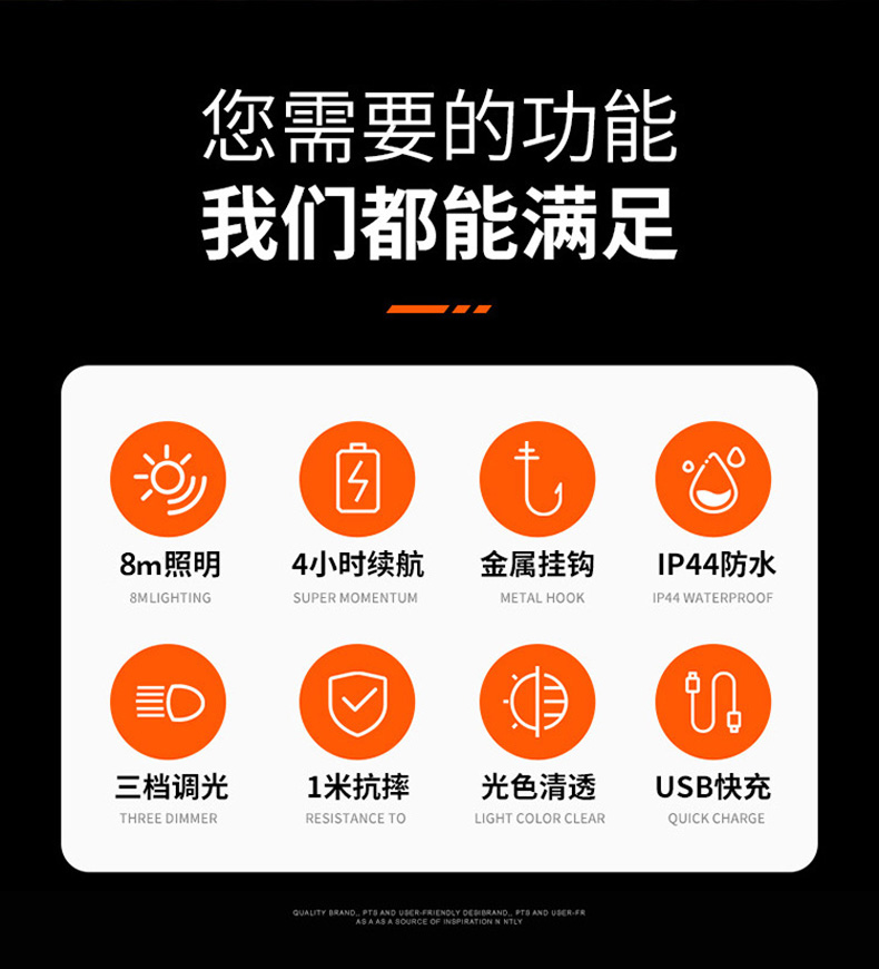 1、可提可掛一燈兩用; 2、順時(shí)針旋轉(zhuǎn)側(cè)面開(kāi)關(guān)開(kāi)啟光源并無(wú)極調(diào)光 ,由低亮至高亮可自由調(diào)節(jié),逆時(shí)針旋轉(zhuǎn)可關(guān)閉光源。 3、充電時(shí)紅色指示燈亮,充滿時(shí)綠色指示燈亮。
