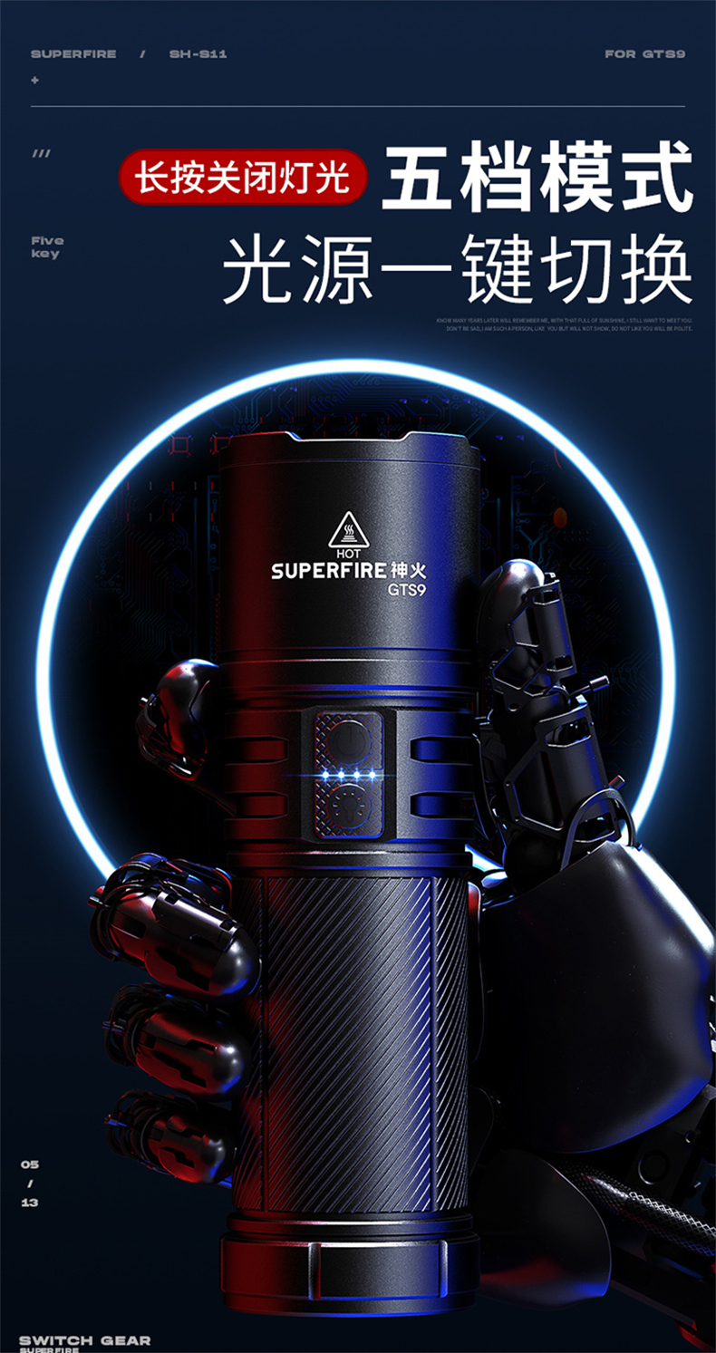 1、精致小巧設(shè)計(jì),37G迷你便攜不累贅; 2、鋁合金外殼,防水抗壓; 3、五檔一鍵切換,適用多重場(chǎng)景。
